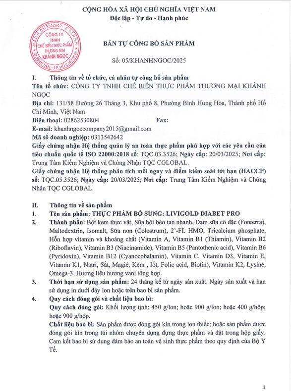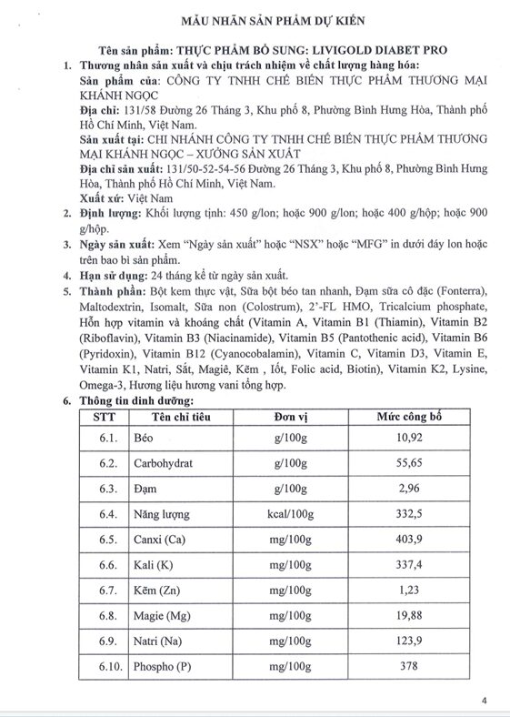 Tên hàng hóa: Sữa Livigold Diabet PRO 900gr