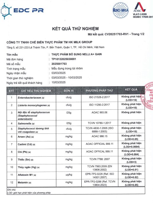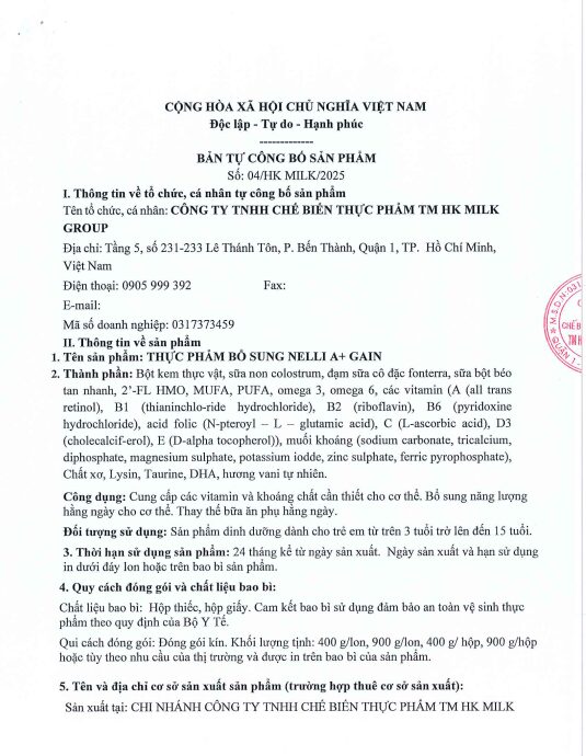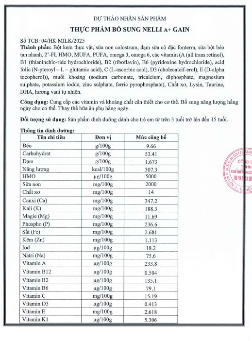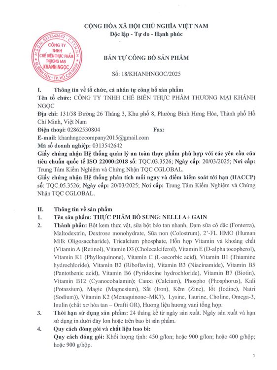 Tên hàng hóa: Sữa Nelli Gain 900gr
