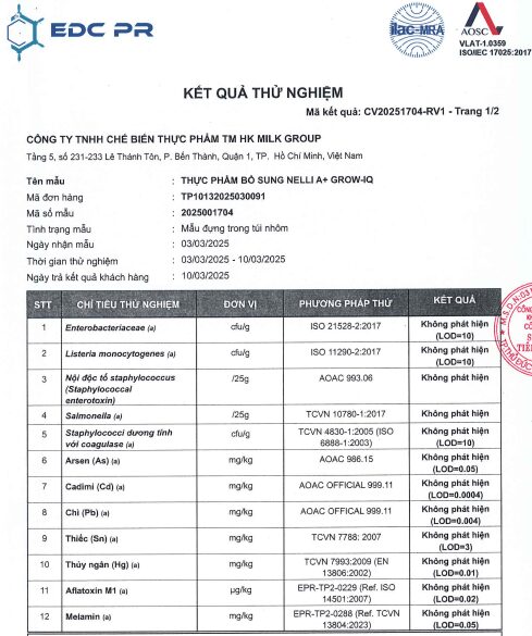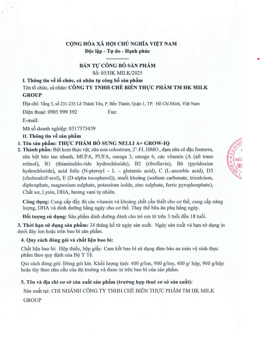 Tên hàng hóa: Sữa Nelli Grow IQ 900gr